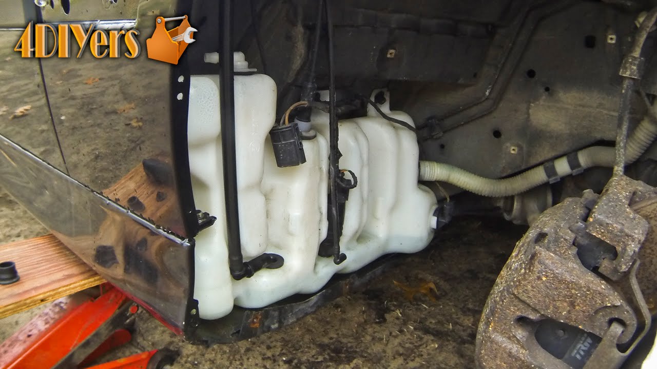 • if there is a significant amount of washer fluid left, place it under the tank and remove the plastic line on the pump