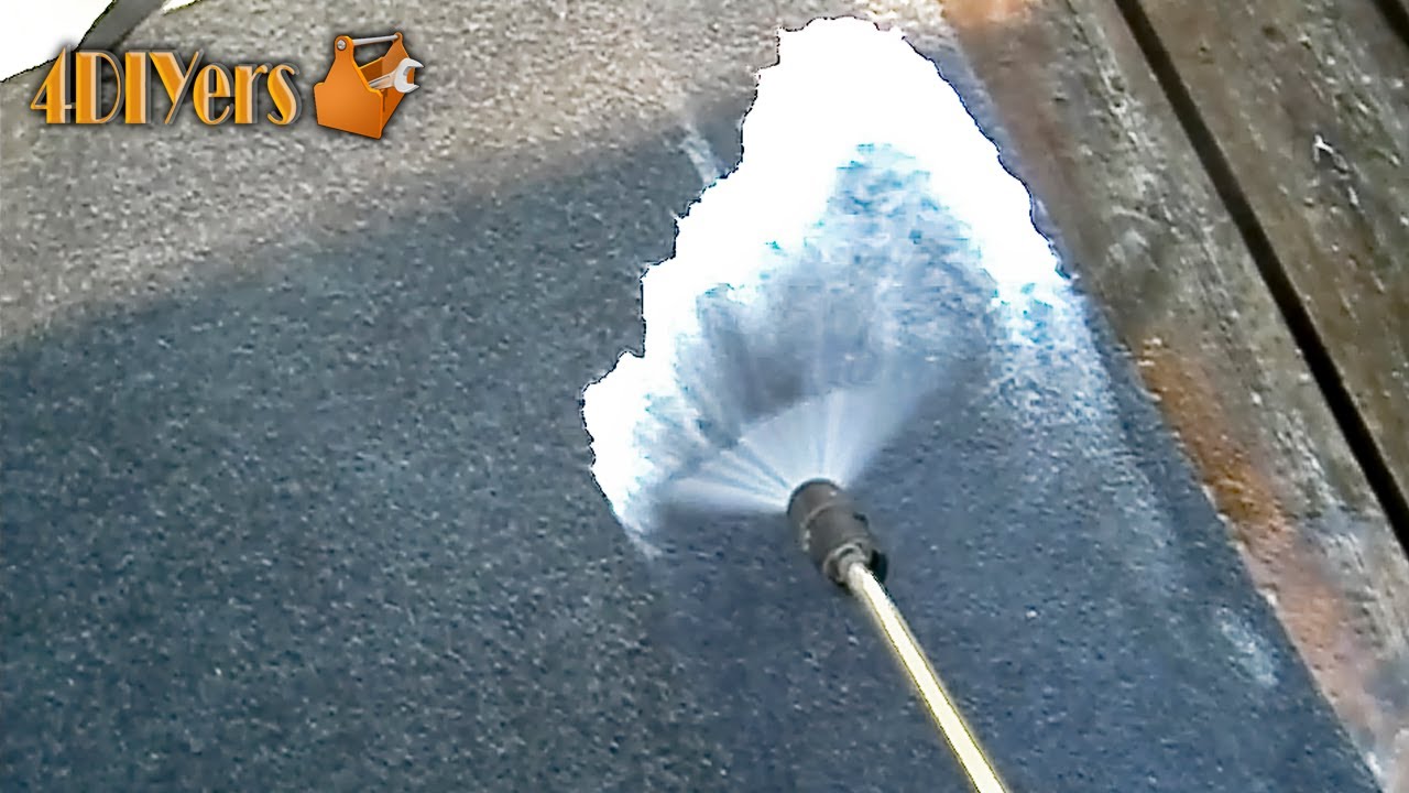 • start your pressure washer, use a large fan spray which will reduce the risk of damaging the carpet and help push any imbedded debris/dirt from the carpet